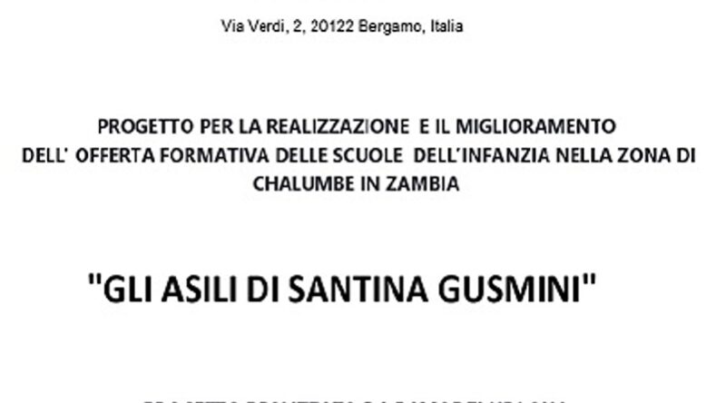 Come vi avevamo anticipato nella nostra ultima comunicazione, stiamo ultimando la stesura del nuovo progetto per il prossimo biennio / triennio, assai più ambizioso delle due scuole costruite e consegnate a Kaulembe nel dicembre scorso, che si chiamerà : ” Gli Asili di Santina Gusmini”;. Consiste nella realizzazione di corsi brevi di formazione per insegnanti volontari svolgenti le funzioni di maestre d’asilo in nove villaggi dell’ area di Chipangali, territorio di Chalumbe, nord est dello Zambia, dove si trova anche il villaggio di Kaulembe, Costruiremo anche un asilo in ciascuno degli otto villaggi inclusi nel progetto.